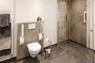 Badezimmer mit Dusche 900 x 900 mm, Duschkabine und Thermostatbrausearmatur Grohe, WC und Waschtisch mit Einhebelmischbatterie Grohe